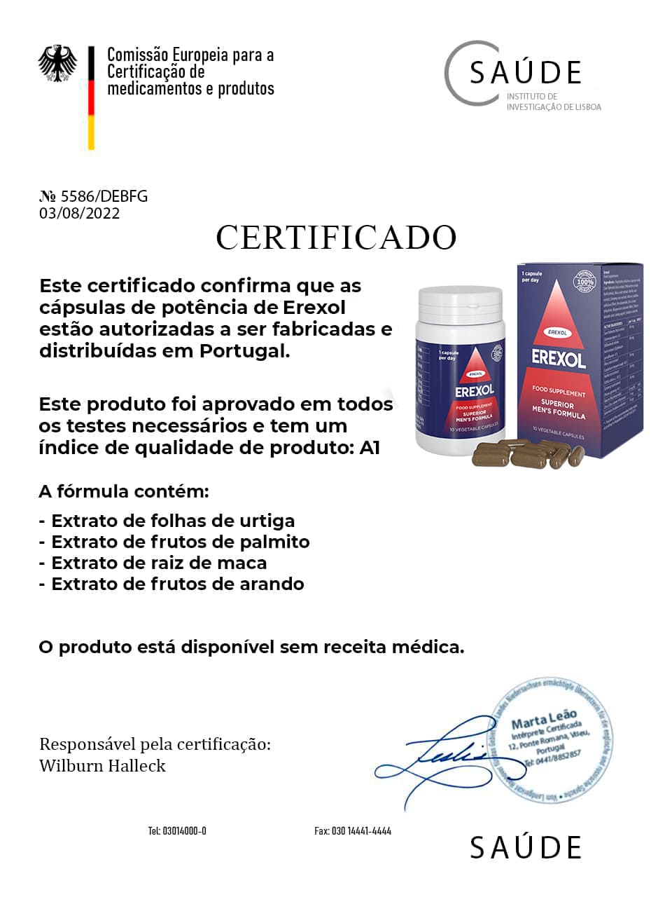E o mais importante - as cápsulas de Erexol foram aprovadas em todos os estudos e testes necessários e receberam certificados de qualidade europeus, o que confirma a sua segurança e eficácia.